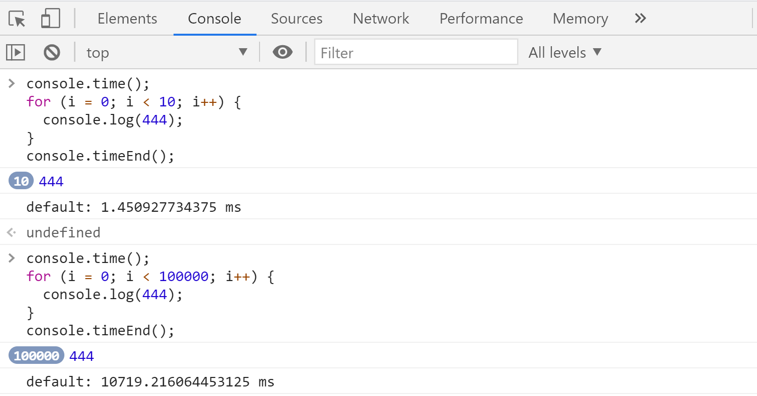 `Console.timeEnd()` – Stops the specified timer and outputs elapsed time in milliseconds, since it was started.